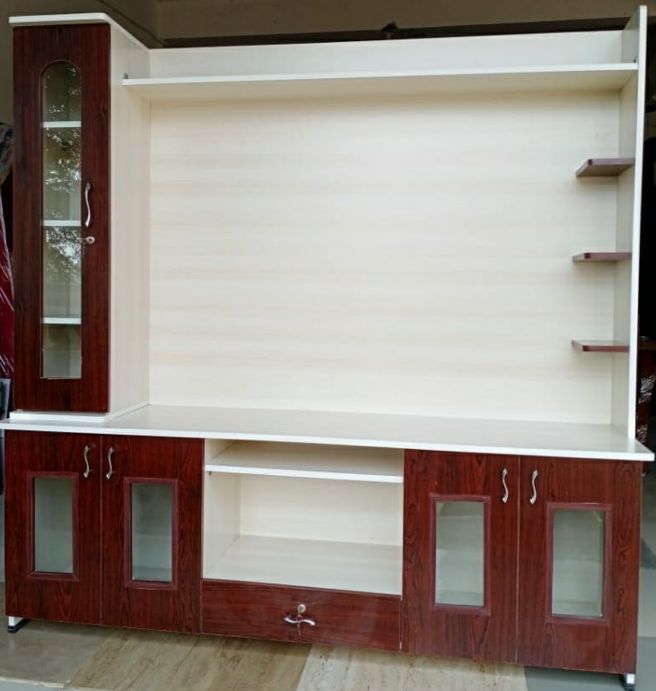 Sleek wall-mounted TV unit with wire management and display shelves.